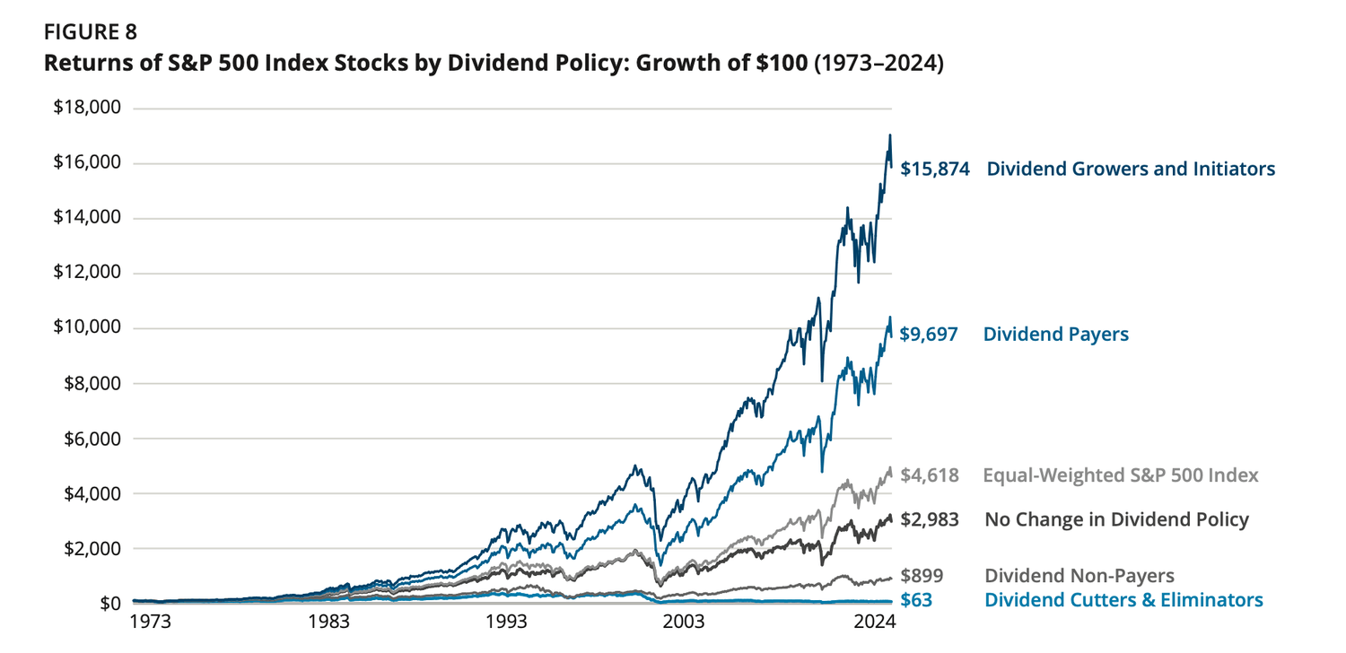 Comme le montre cette étude de hartfordfunds, les entreprises qui versent et augmentent leur dividende (Dividend Growers and Initiators) surperforment la plupart des autres entreprises en bourse. ➡️