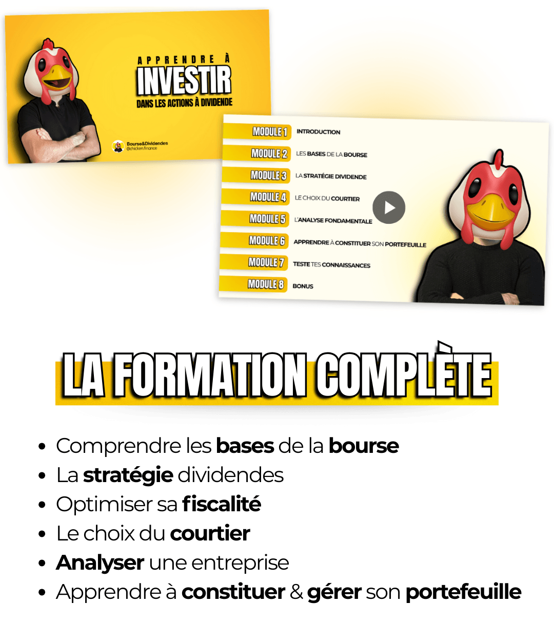 C’est parfait, cette formation s’adresse aussi bien aux personnes qui débutent, en expliquant étape par étape comment mettre en place une stratégie d’investissement solide et générer un complément de revenu grâce aux dividendes, qu’aux personnes qui ont déjà un portefeuille boursier et qui souhaite apprendre à développer toute la puissance des dividendes dans leur stratégie.